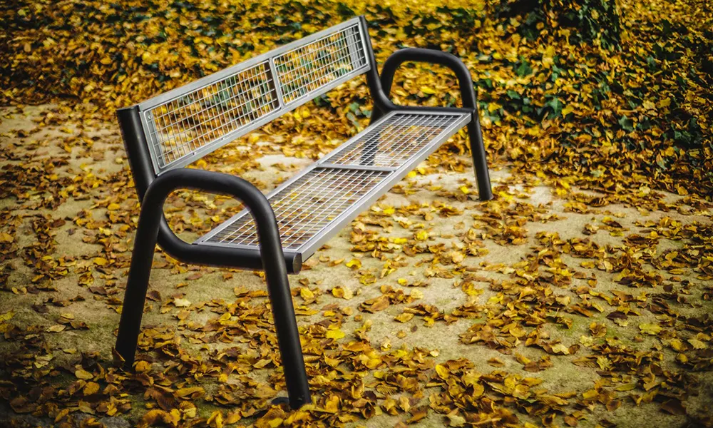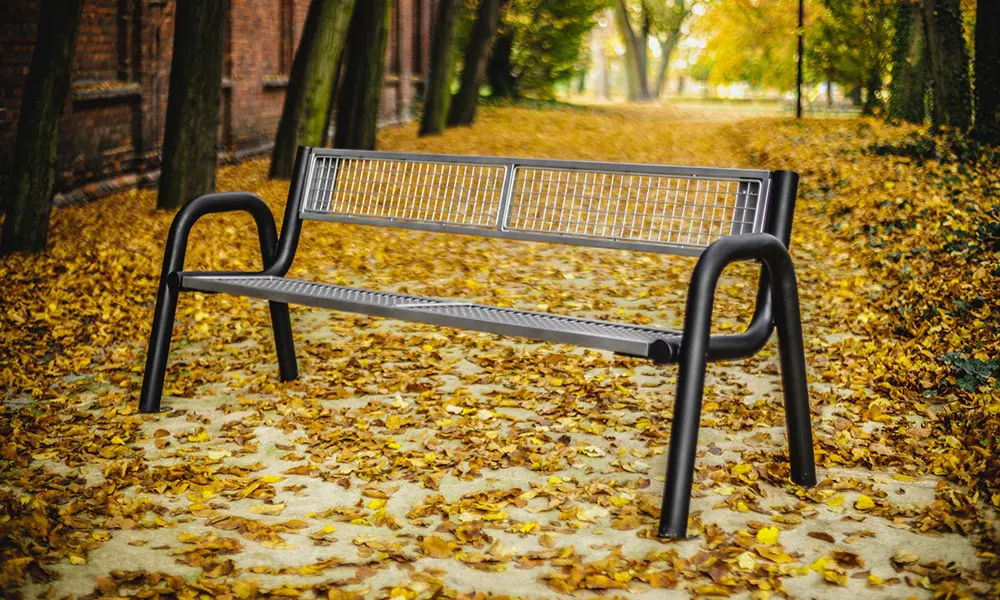 Banco Spartan Solid: estructura de marcos de acero cerrado con rejilla le da un carácter extremadamente modernista. El banco está hecho completamente de metal.