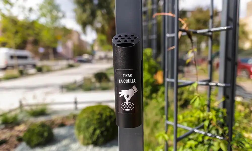 Los orificios en la parte superior permiten apagar el cigarro, depositar las colillas y minimizar el olor del tabaco. Muy fácil de vaciar y de gran resistencia. Pensado para el exterior. Ideal para uso en centros comerciales, ayuntamientos, entradas a empresas, zonas de ocio y hostelería.