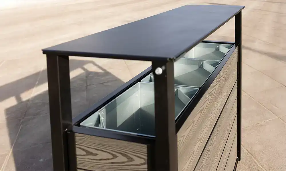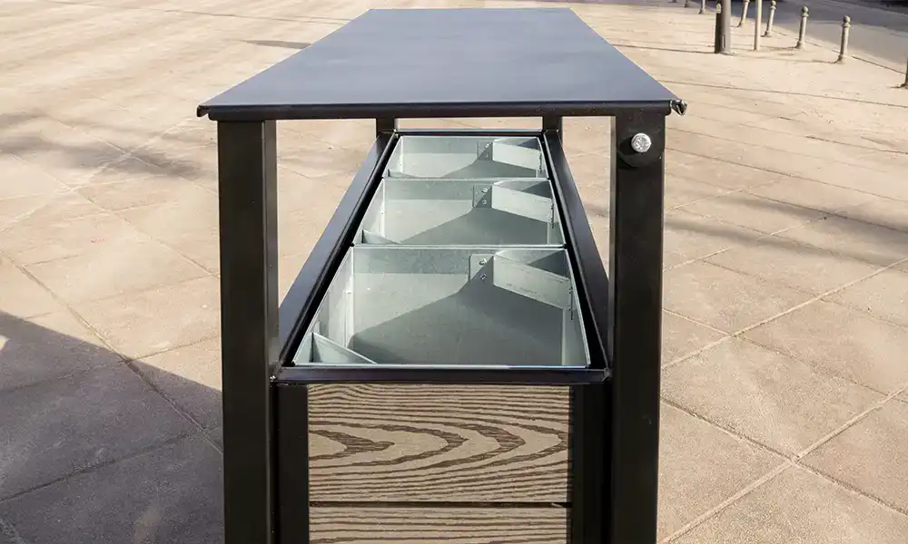 La estructura de acero pintada en polvo, junto con los cubos galvanizados, garantiza una alta resistencia a la corrosión y al uso intensivo en espacios públicos. Su forma sencilla y ordenada permite integrarla fácilmente tanto en entornos modernos como clásicos.