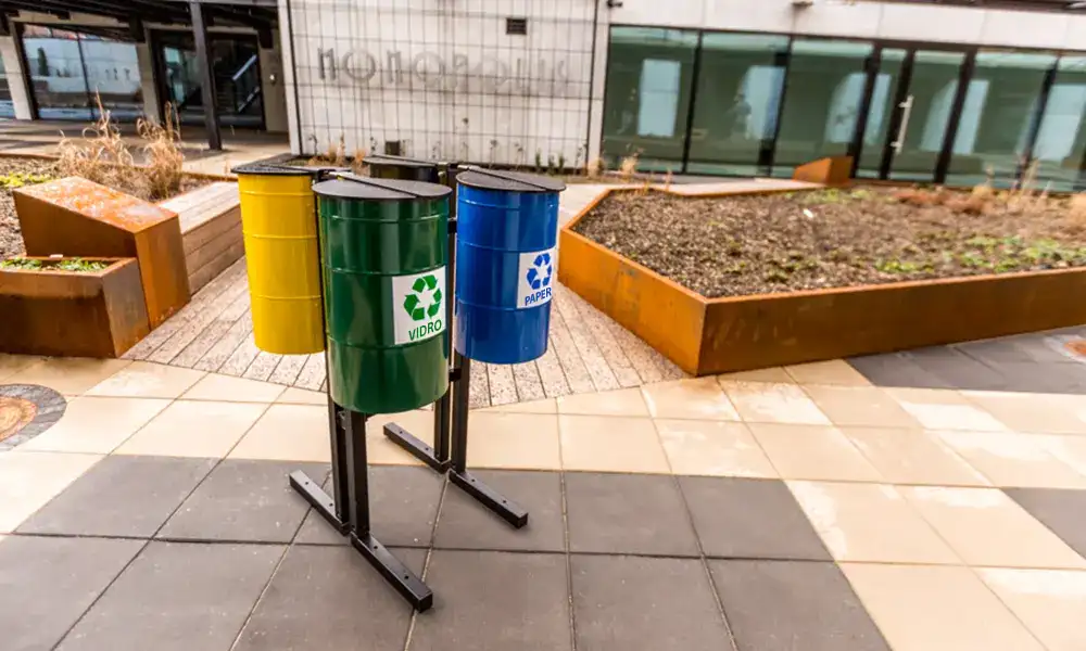 Papelera de reciclaje «Trébol» con cuatro cubetas individuales: la estructura de perfiles de acero con cuatro cubetas individuales pintadas en polvo en colores identificativos para el reciclado. Cada uno de los contenedores tiene una placa en la parte superior indicando el tipo de residuo para facilitar la segregación.