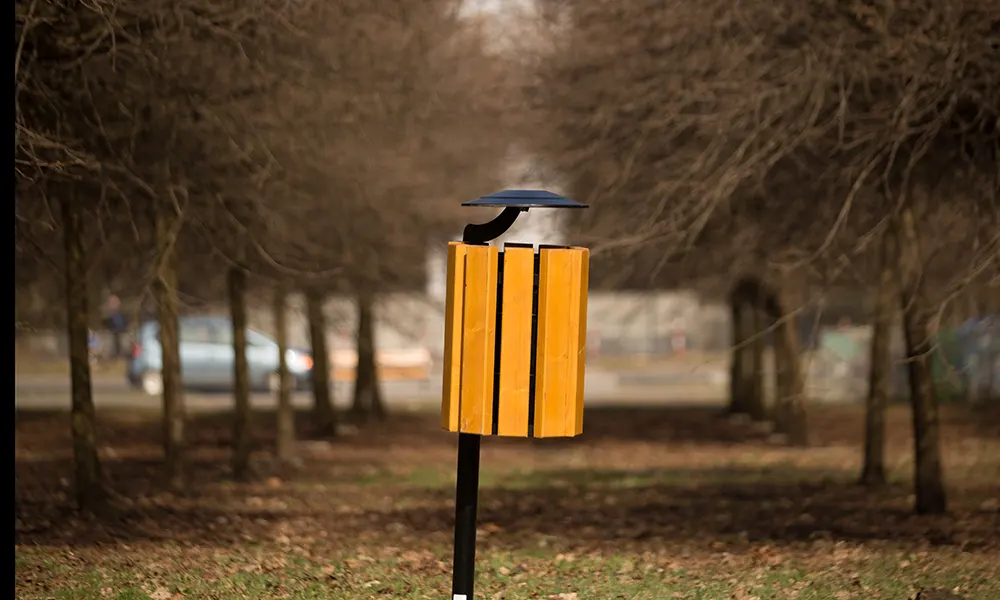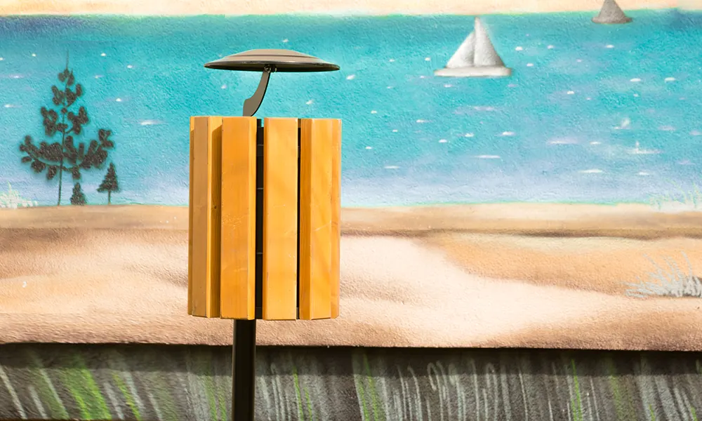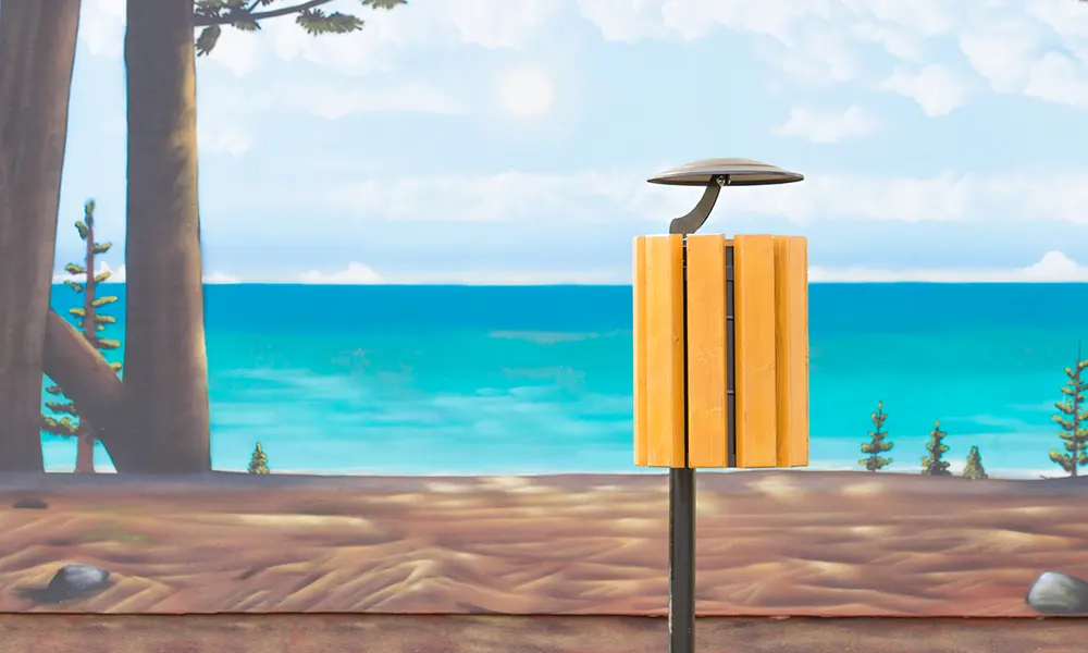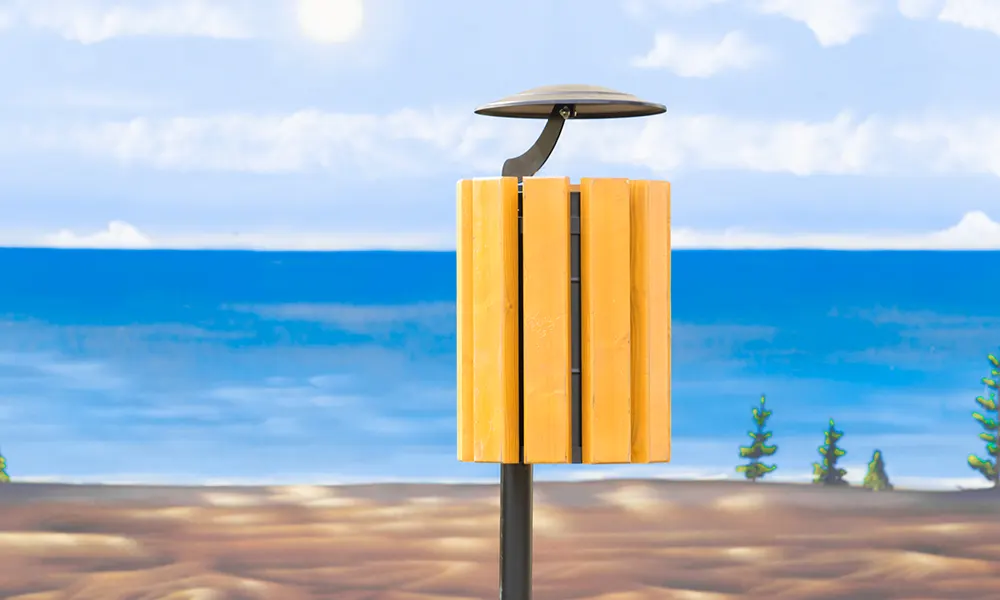 Papelera abatible y extraíble, montada en un poste. Tiene un revestimiento de 9 listones de madera para proporcionar un aspecto atractivo y natural. Además, cuenta con un techo para proteger el contenido de la lluvia y viento.